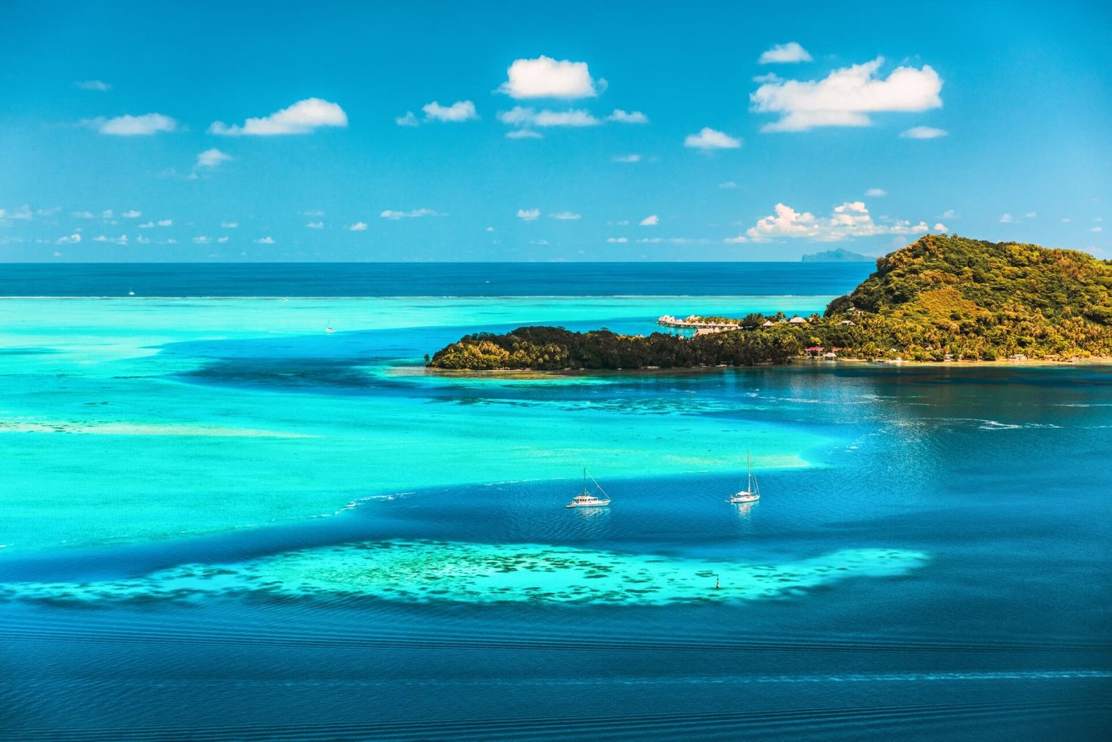 Le lagon aux 50 nuances de bleu : Bora Bora est célèbre pour son lagon d’une beauté surnaturelle, avec des eaux qui passent du turquoise au bleu profond. La transparence de l’eau est telle que vous pouvez voir clairement la vie marine en dessous, même sans vous immerger. Ce paysage est un chef-d’œuvre de la nature, encadré par les silhouettes verdoyantes des monts Otemanu et Pahia.